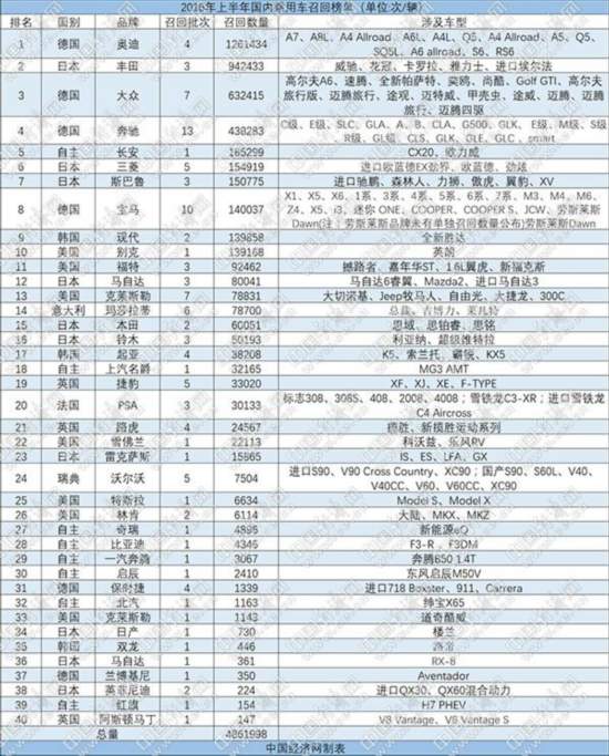 2017年上半年中国乘用车市场召回榜单