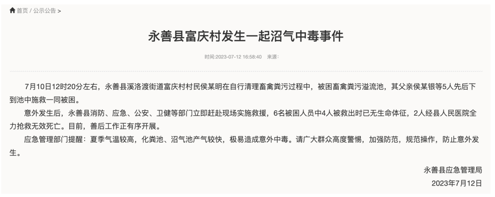 据云南省昭通市永善县应急管理局消息,7月10日12时20分左右,永善县溪洛渡街道富庆村村民侯某明在自行清理畜禽粪污过程中,被困畜禽粪污溢流池,其父亲侯某银等5人先后下到池中施救一同被困。最终,6人不幸身亡。