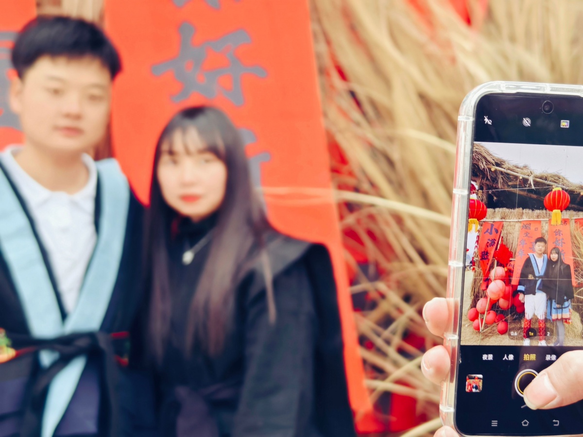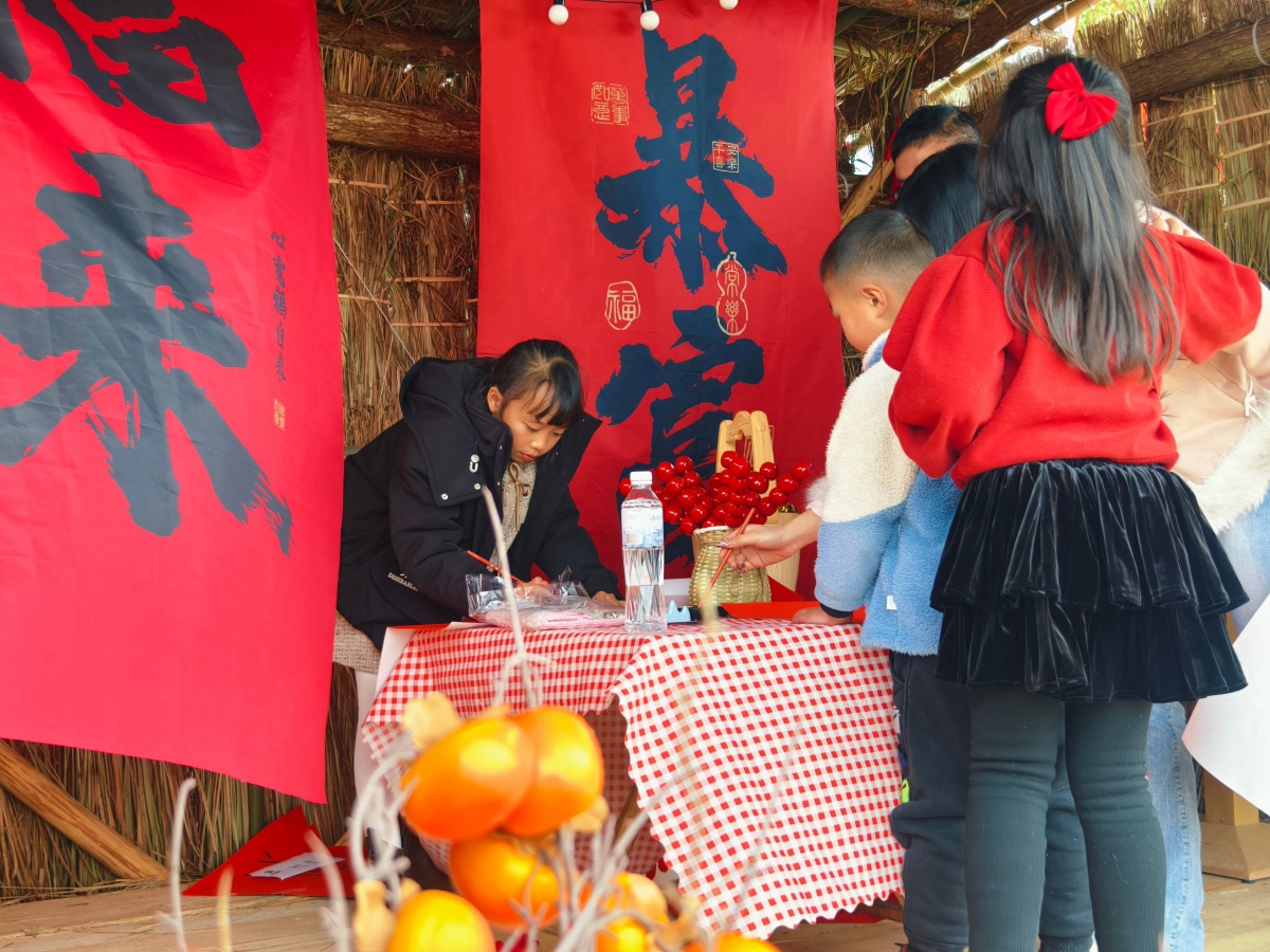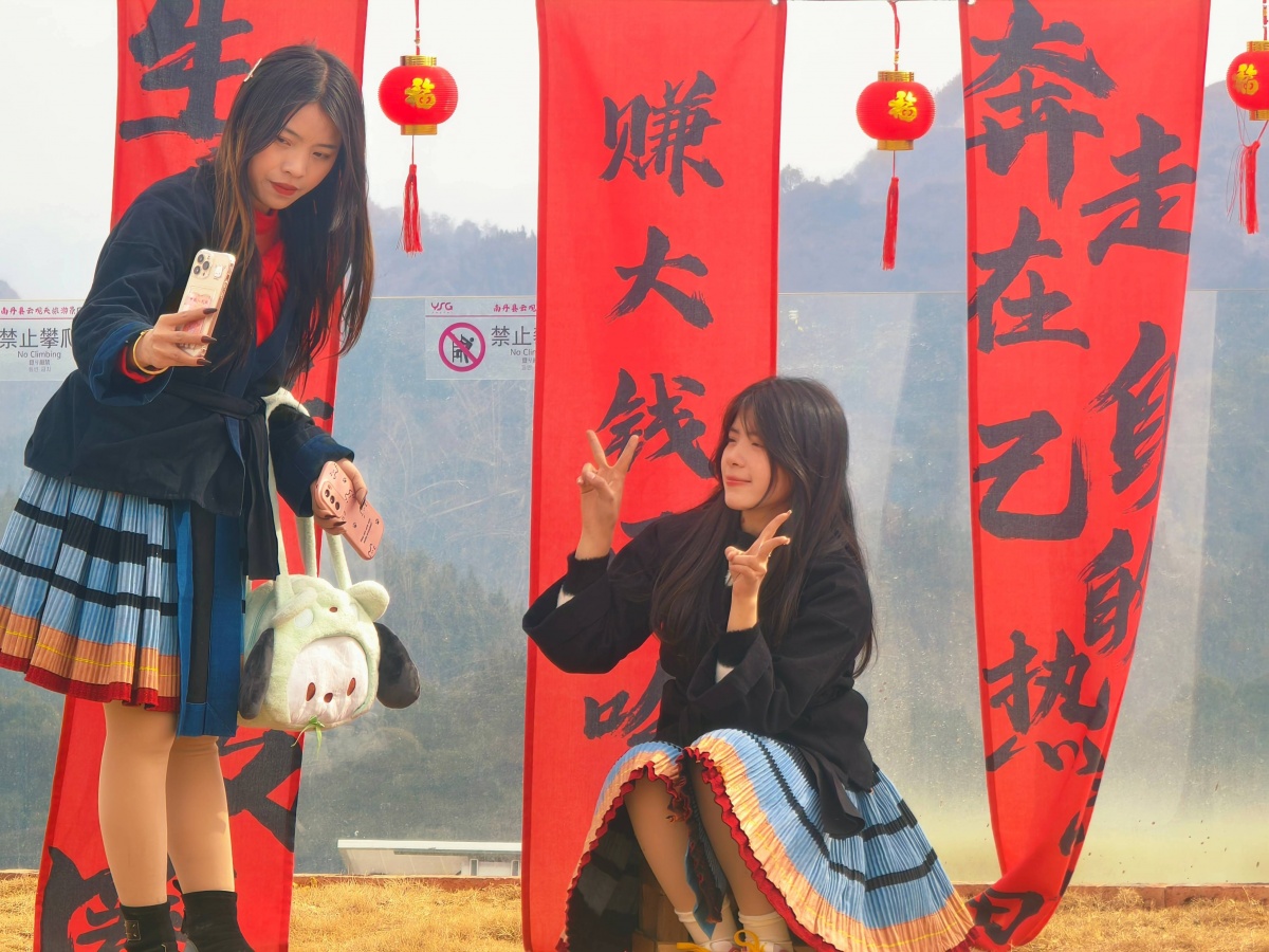 在云观天景区内,张灯结彩,喜气洋洋,游客们纷至沓来。其中,“福绘新岁”共绘百福图活动尤为引人注目,游客们手持画笔,在百米长卷上共同绘制“福”字,每一笔都蕴含着对新年的美好祝愿。一位来自南宁的游客李女士表示:“这是我第一次参加这样的活动,在登高望远的同时,还能亲手绘制‘福’字,为新的一年祈福,真是太棒了。”