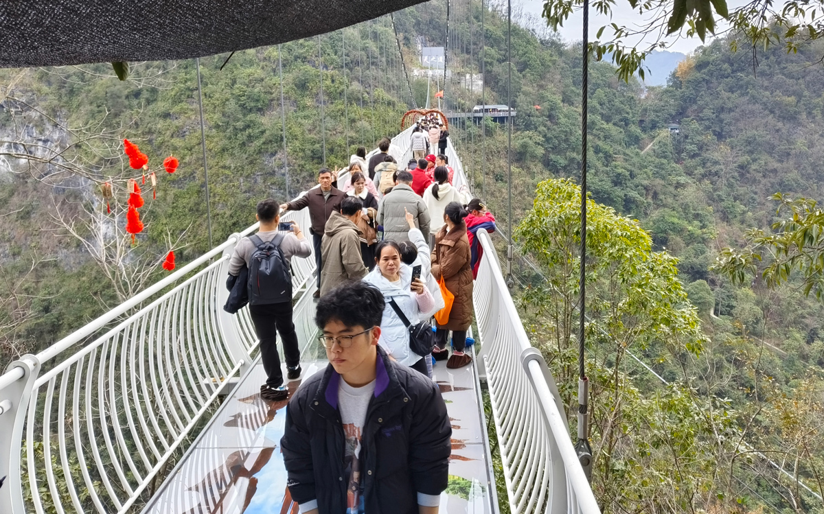 与云观天景区的传统韵味不同,丹炉山景区以现代设备与自然景观融合吸引了众多游客的目光。该景区的玻璃栈道悬于峭壁之上,全长约300米,走在上面仿佛凌空漫步于云端。许多游客选择在这里登高望远,俯瞰崎岖山脉美景,感受新年暖阳带来的美好与希望。